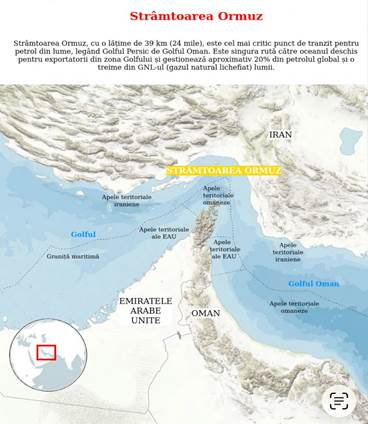 Strâmtoarea Hormuz este, simultan, un coridor geografic îngust și o infrastructură juridică globală: prin această strâmtoare au tranzitat în 2024 aproximativ 20 milioane barili/zi de petrol, aprox. 20% din consumul global de lichide petroliere, iar importanța pentru piețele LNG[7], în special Asia, este confirmată de date instituționale recente[8].