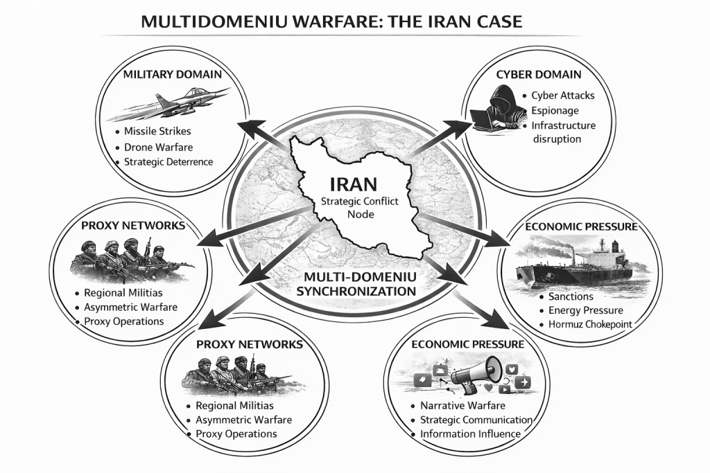 Aplicarea modelului analitic propus la cazul Iranului confirmă că acesta nu poate fi înțeles adecvat printr-o grilă exclusiv militară. Iranul reprezintă, în arhitectura strategică a Orientului Mijlociu, un caz paradigmatic de conflict multidomeniu, deoarece asupra sa și prin intermediul său operează simultan presiuni militare, cibernetice, economice, informaționale, proxy și diplomatico-juridice. Relevanța empirică a modelului a devenit și mai evidentă după escaladările din 2025–2026: în iunie 2025, Israelul a lovit ținte nucleare și militare iraniene, inclusiv instalații asociate programului nuclear, iar Iranul a răspuns cu atacuri cu rachete; la începutul lunii martie 2026, Consiliul de Securitate și lideri europeni avertizau deja asupra riscului unui război regional extins și asupra efectelor destabilizatoare asupra întregului Orient Mijlociu.