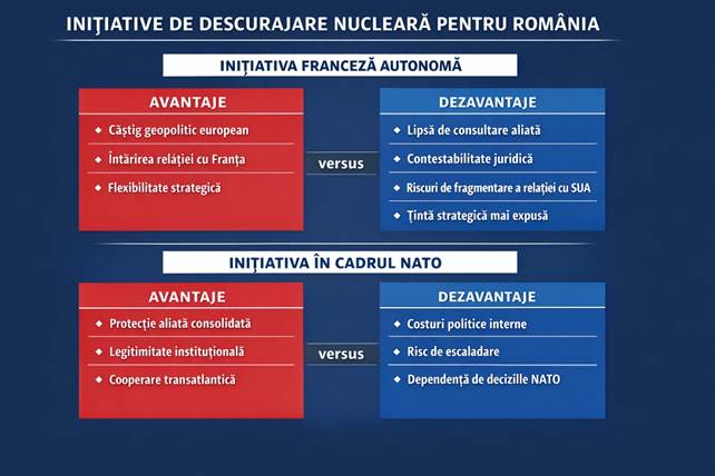 Dintr-o perspectivă strict analitică, România nu are, în acest moment, suficiente motive pentru a trece de la interes strategic la acceptarea găzduirii unor componente ale descurajării nucleare franceze, mai ales în forma autonomă sugerată de actuala doctrină franceză. Datele publice indică faptul că inițiativa franceză este reală, că dialogul cu partenerii europeni se adâncește și că România a fost invitată la discuții, însă tot datele publice arată că Bucureștiul a exclus, deocamdată, găzduirea.