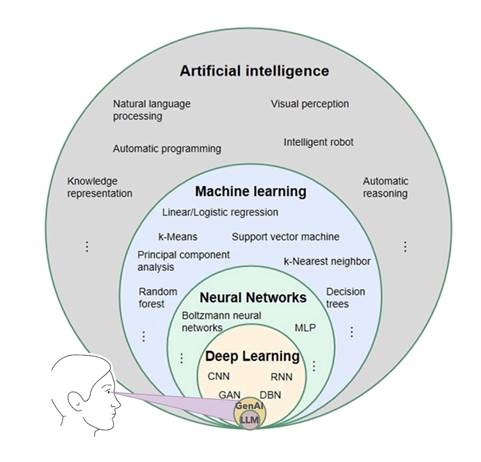 De asemenea, figura sugerează că sistemele de tip GenAI sau LLM (modele generative de limbaj) folosesc tehnici de Deep Learning pentru a interpreta și genera informații, simulând percepția și înțelegerea umană.