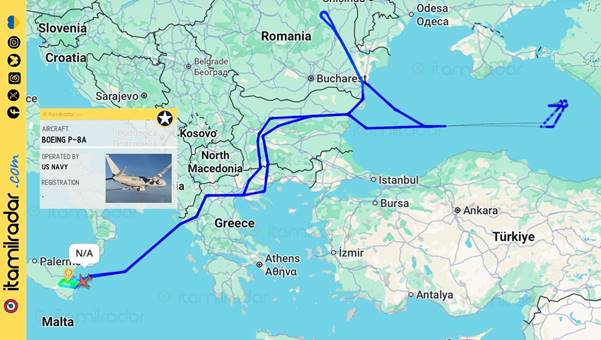 Un P-8A Poseidon al Marinei SUA a plecat din Sigonella și și-a stabilit traseul obișnuit de supraveghere deasupra Mării Negre de vest, menținând un model aproape de apele internaționale, dar clar orientat spre monitorizarea activității navale și costiere rusești.