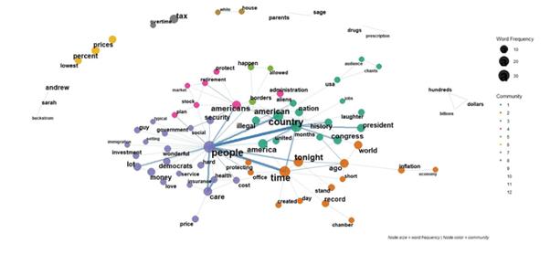 Figura 2 este un grafic al rețelei de co-apariție a cuvintelor, dimensionată în funcție de frecvența cuvintelor. Fiecare nod reprezintă un cuvânt, iar dimensiunea nodului corespunde frecvenței cuvintelor. Grosimea marginilor indică numărul de apariții împreună a cuvintelor asociate, iar culorile pentru fiecare nod reprezintă o comunitate de grupuri corespondente de cuvinte care au apărut, de asemenea, împreună. Ceea ce pare să arate analiza este o atracție și o concentrare mai mare asupra națiunii și a oamenilor în acest an (de exemplu, America, americani, țară și oameni) în comparație cu discuțiile despre probleme de fond, cum ar fi locurile de muncă, economia sau inflația (chiar dacă și acești termeni au fost menționați). Per total, a existat foarte puțin conținut despre probleme de politică externă, în timp ce au existat mai multe referințe la cuvinte precum investiții, bani, frontieră, impozit, inflație, Congres și lume.
