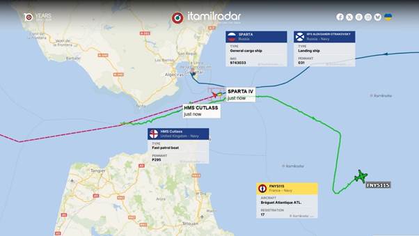 Sparta IV a părăsit astăzi Marea Mediterană, traversând spre vest Strâmtoarea Gibraltar sub escorta navei de debarcare a Marinei Ruse RFS Aleksandr Otrakovsky. Au lipsit notabil distrugătorul Severomorsk și petrolierul Kama, care par să fi schimbat cursul și să se fi îndreptat spre est în ultimele zile. Plecarea navei de marfă rusă a fost monitorizată îndeaproape de nava de patrulare a Marinei Regale HMS Cutlass și de o aeronavă de patrulare maritimă a Marinei Franceze Atlantique , subliniind supravegherea continuă a NATO asupra mișcărilor navale rusești.